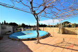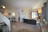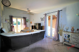 Un séjour ainsi qu'une cuisine équipée donnant sur terrasse et piscine